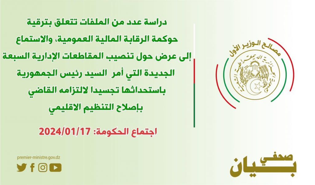 ترأس الوزير الأول، نذير العرباوي هدا الأربعاء 17 جانفي 2024، اجتماعًا للحكومة، خصّص لدراسة عدد من الملفات تتعلق :