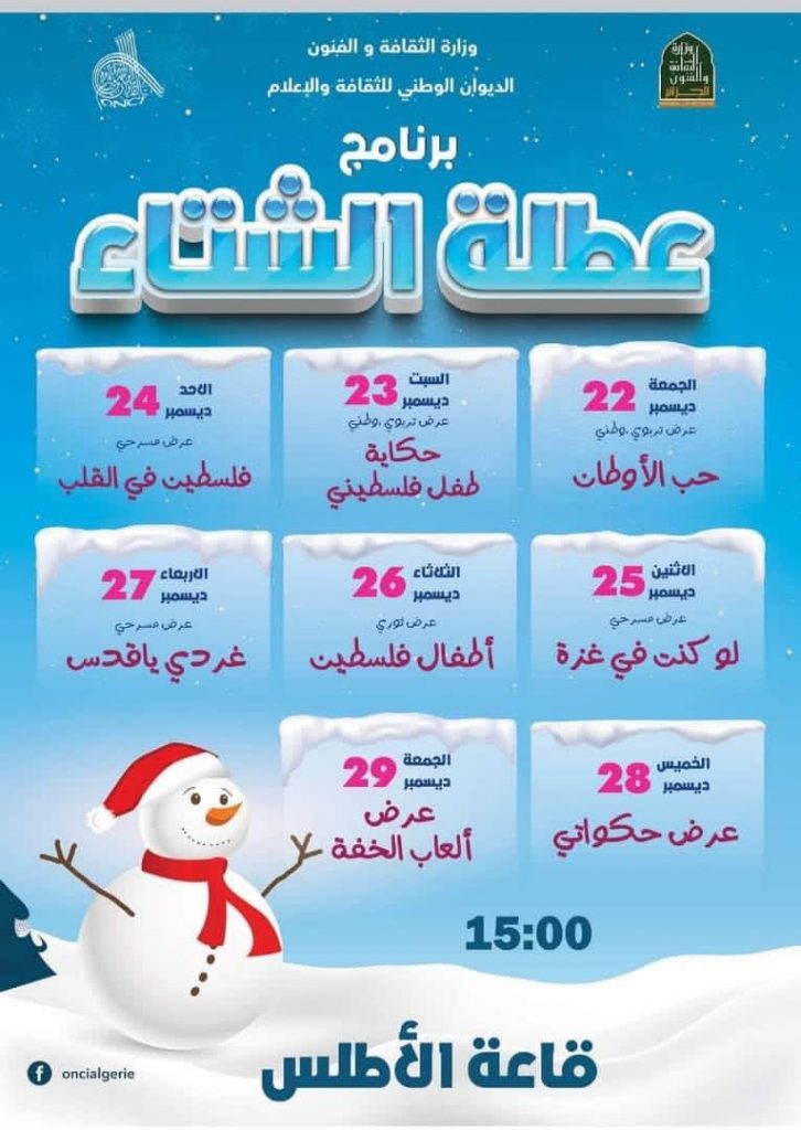ينظم الديوان الوطني للثقافة والإعلام برنامجا خاصا بفئة الاطفال خلال العطلة الشتوية الممتدة من 22 إلى 30 ديسمبر 2023 ، يتضمن عروض مسرحية، ألعاب خفة، حكواتي وهذا بشكل يومي بداية من الساعة الثانية ظهرا 14:00سا، عبر العديد من القاعات التابعة للديوان.
