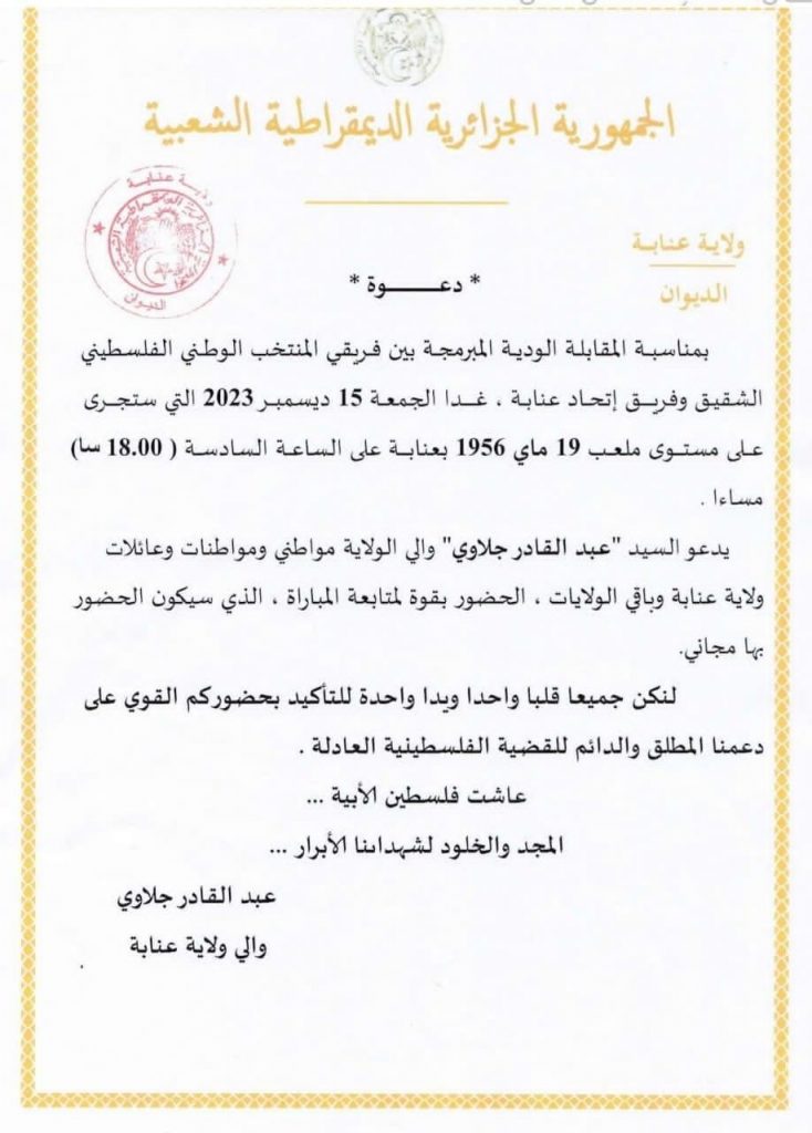 والي عنابه عبد القادر جلاوي يدعو ساكنة عنابه لحضور مقابلة فريق المنتخب الوطني الفلسطيني وفريق اتحاد عناية اليوم الجمعة بملعب 19 ماي على الساعة السادسة مساءا