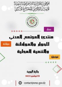 يشرف نورالدين بن براهم رئيس المرصد الوطني للمـــجتمع المــــدني، هذا الاثنين 13 نوفمبر 2023 ، بمعية ا عبد الكريم لعموري، والي البويرة، على أشغال منتدى المجتمع المدني للحوار والمواطنة والتنمية المحلية للولاية، و ذلك على مستوى دار الثقافة “علي زعموم” .